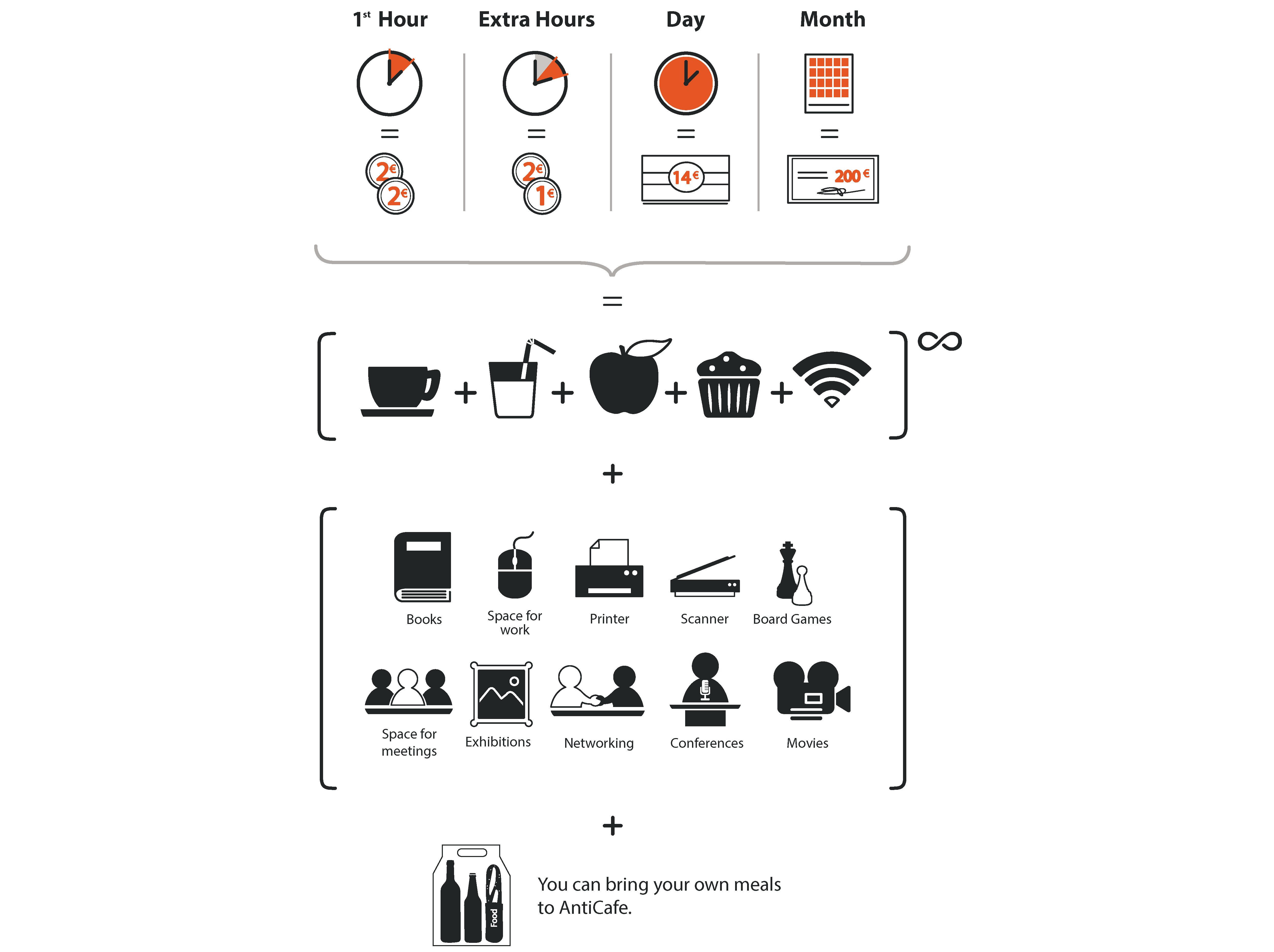 L’ultima iniziativa che vi segnaliamo è in Italia e se andrete a Roma potrete provare AntiCafé il primo bar del tempo italiano. Qui non si pagano le consumazioni ma il tempo trascorso nel locale. In Europa esistevano già lo Ziferblat a Londra, lo Slow Time Cafe in Germania nella cittadina di Wiesbaden e diversi bar del tempo a Mosca e a Parigi dove il concetto di “c-office” è molto apprezzato. Ma come funziona un time cafe? Gli ideatori di AntiCafé hanno creato questo spazio per cambiare in modo radicale il concetto di caffetteria e per fornire uno spazio di lavoro, studio e svago ai cittadini di Roma. Lo spazio è dotato di WiFi gratuita, proiettori e strumentazioni sono messe a disposizione degli ospiti, come in un coworking, e bevande e vivande sono offerti gratuitamente senza limitazioni se non quella del buon senso. La prima ora costa 4 € e ogni ora successiva ne costa 3 ma è possibile come per i mezzi pubblici stipulare abbonamenti giornalieri e addirittura mensili.